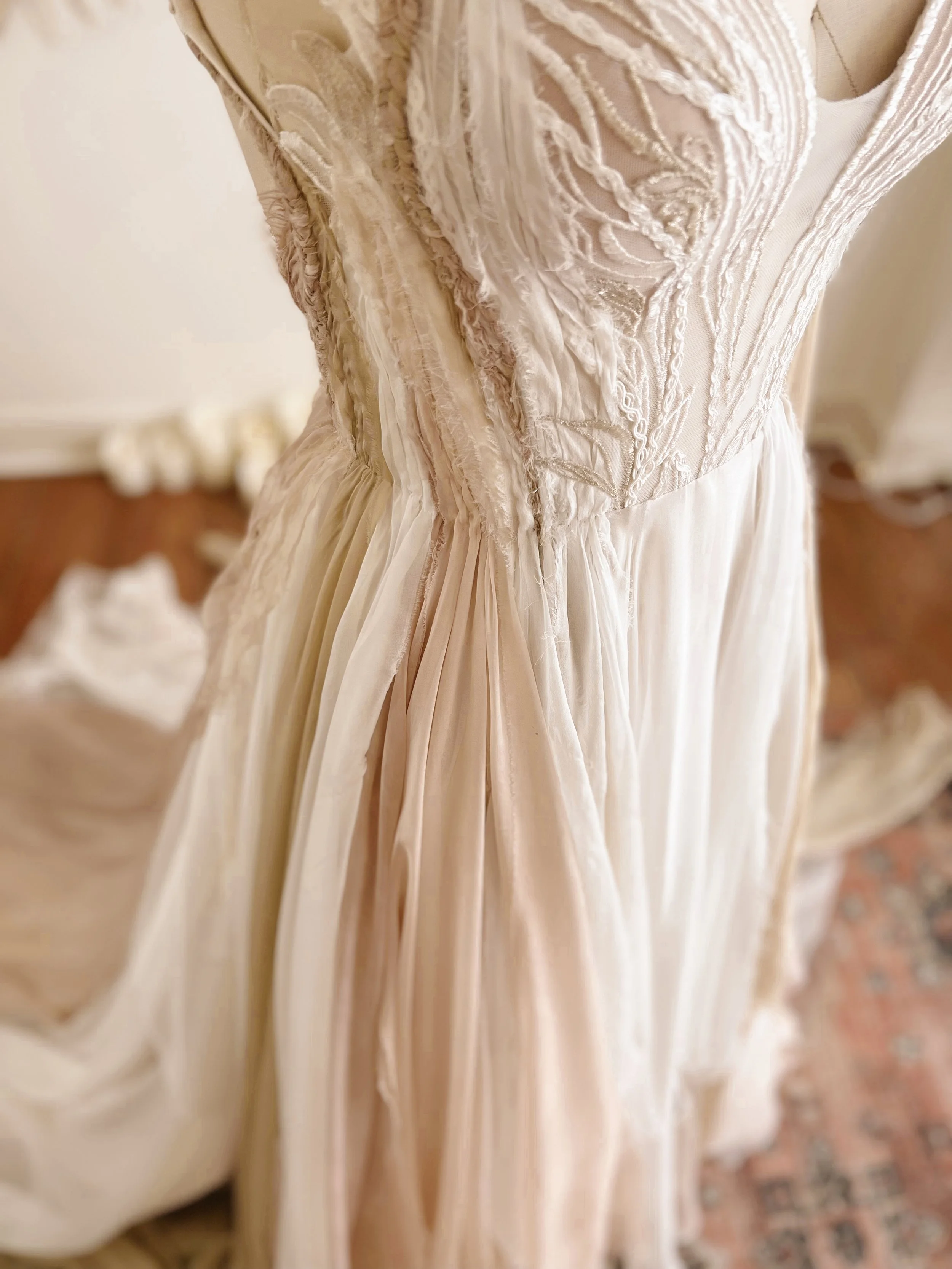 Joelle also wanted to incorporate golden hues of silk chiffon in her dress. She loved the sweetheart neckline, fishtail spaghetti straps, open back and asymmetrical back detail of our original Swan wedding dress.