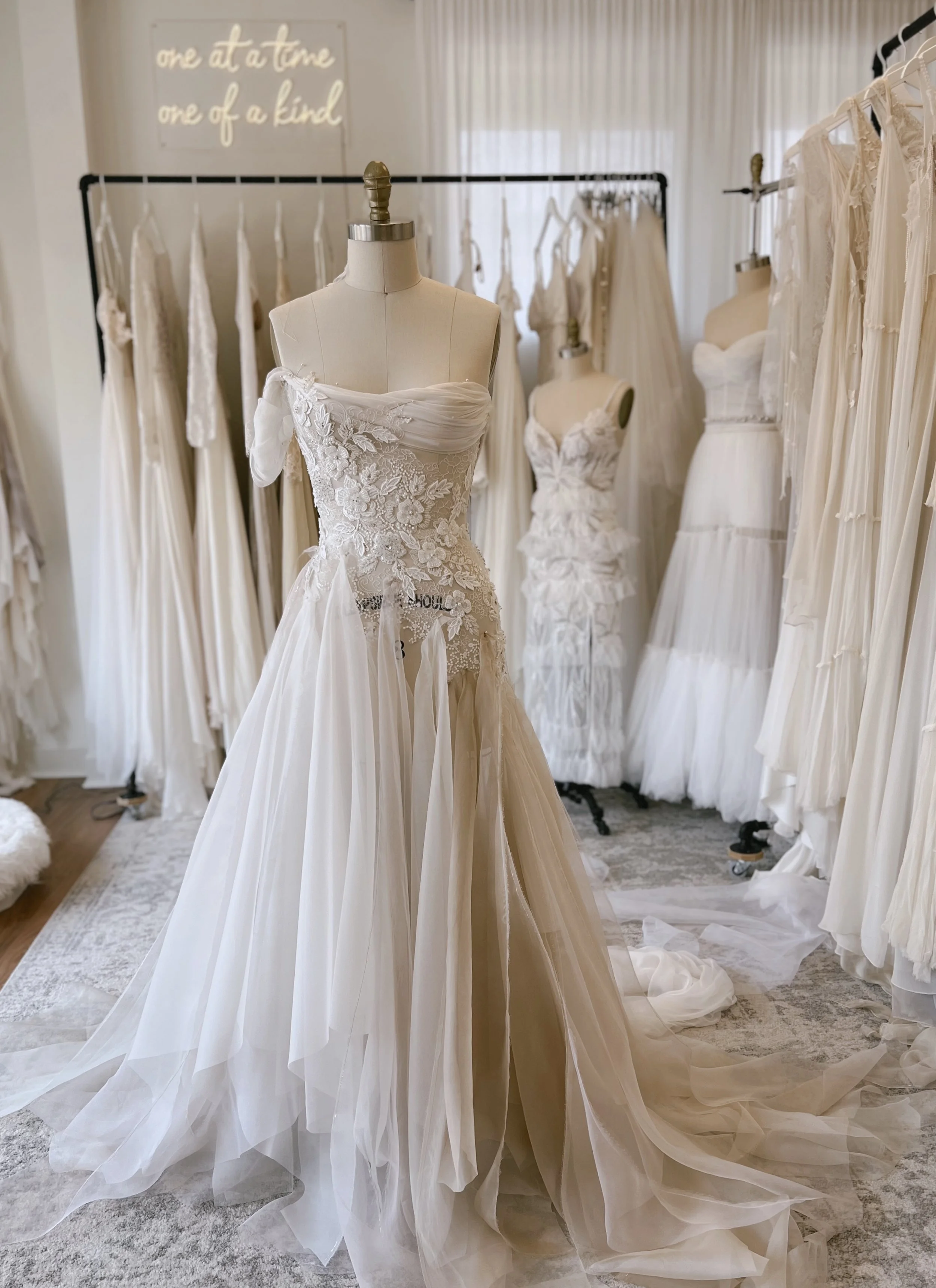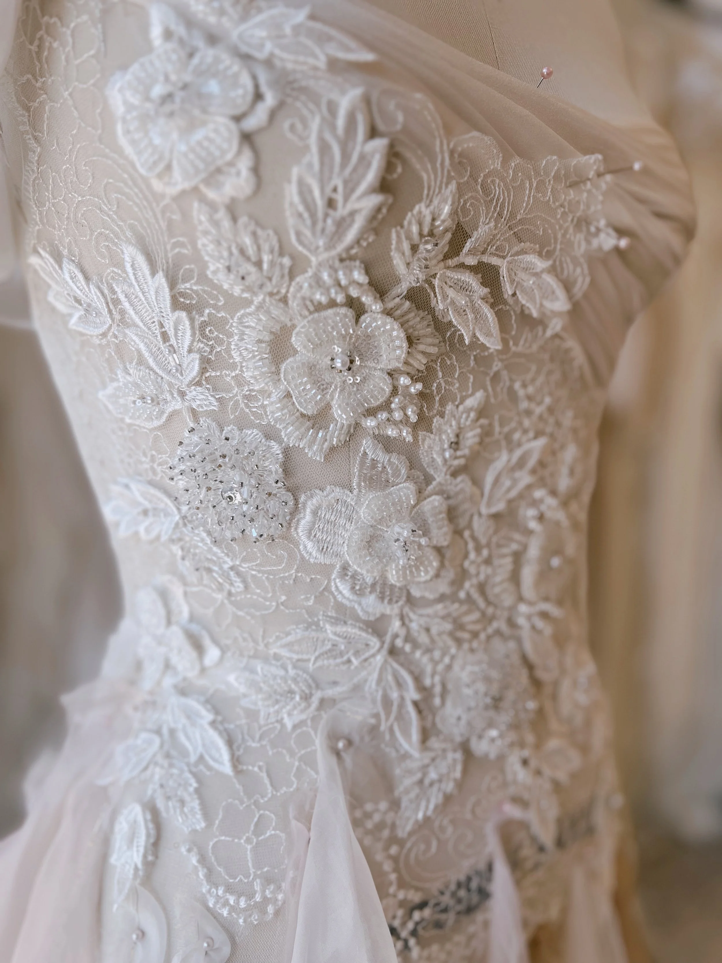 I was inspired by one of our most favorites 3D beaded floral laces. This unique lace has a combination of two laces: a delicate embroidered floral dainty lace and a heavier 3D beaded floral lace. It creates an organic look. Inspired by our Heidi wedding dress, I placed the lace asymmetrical in the torso waist area, the lace coming down on the left hip.